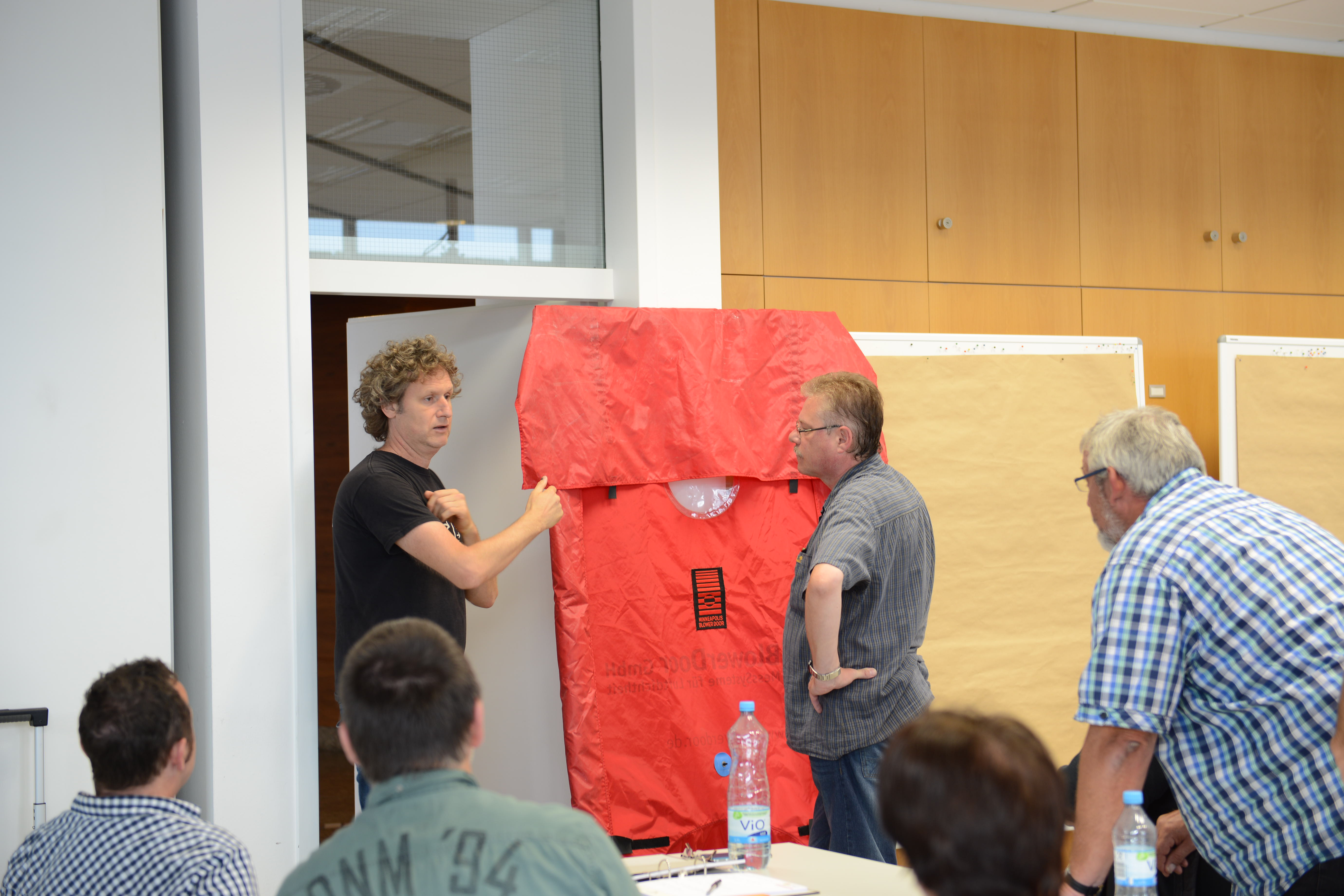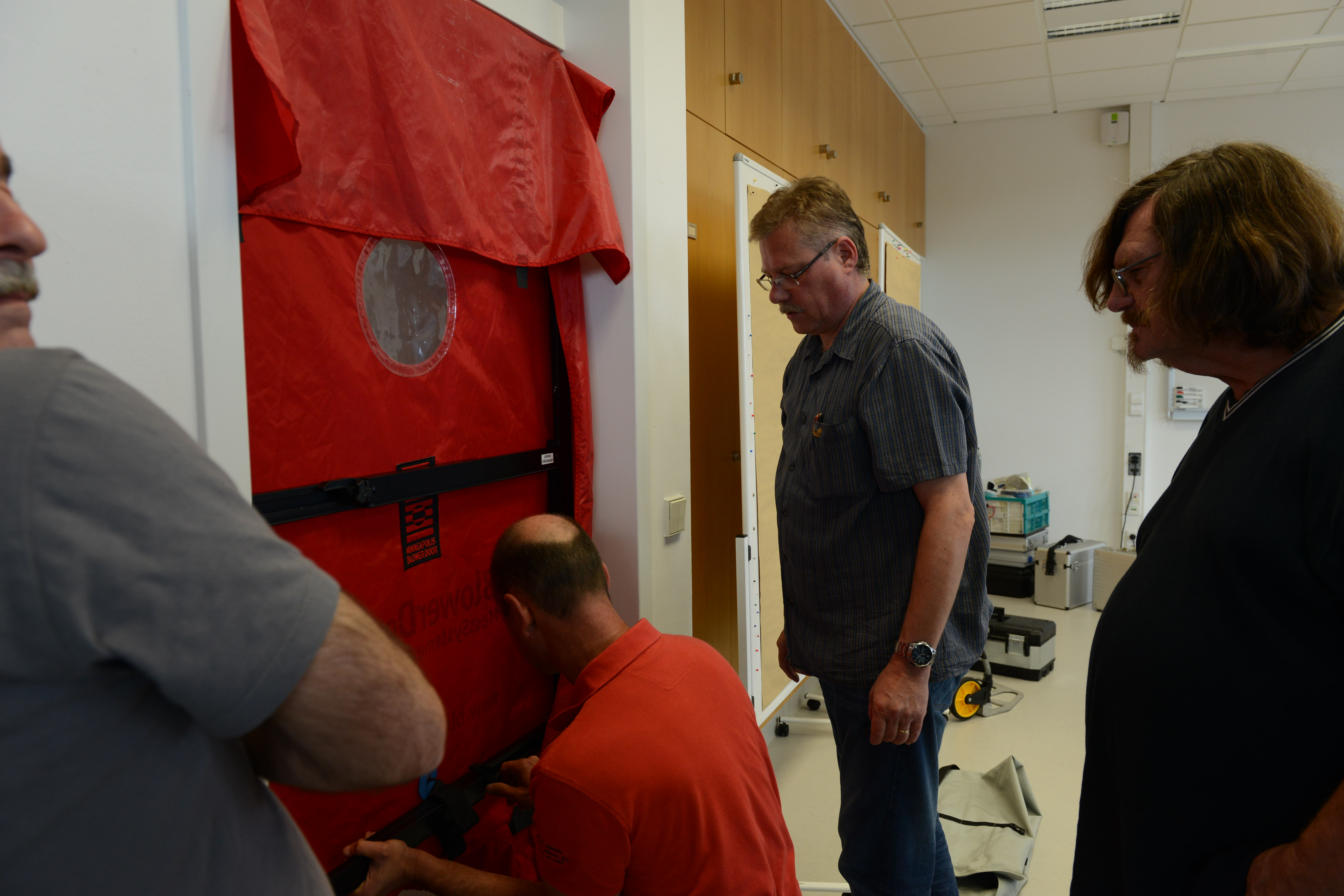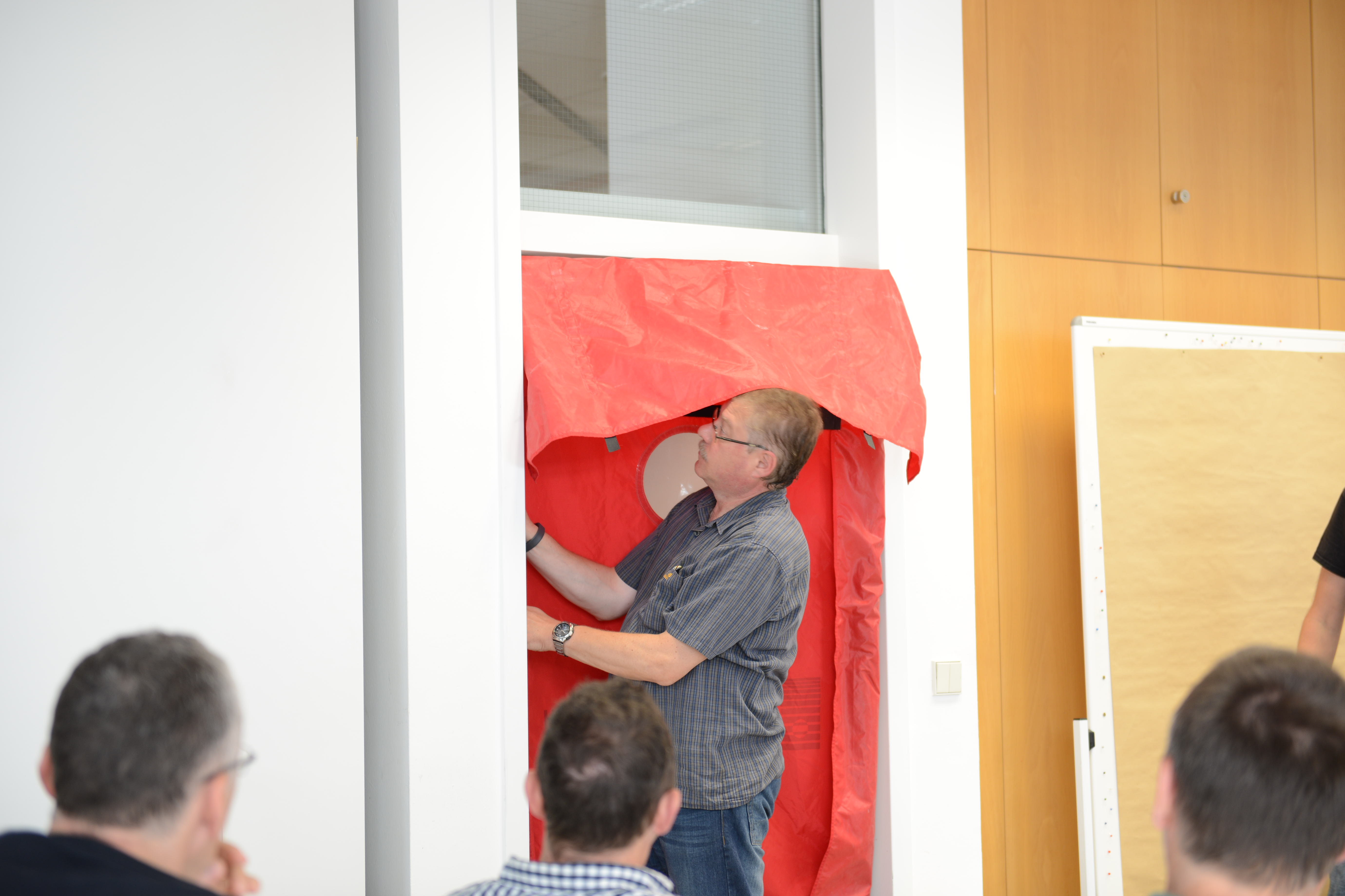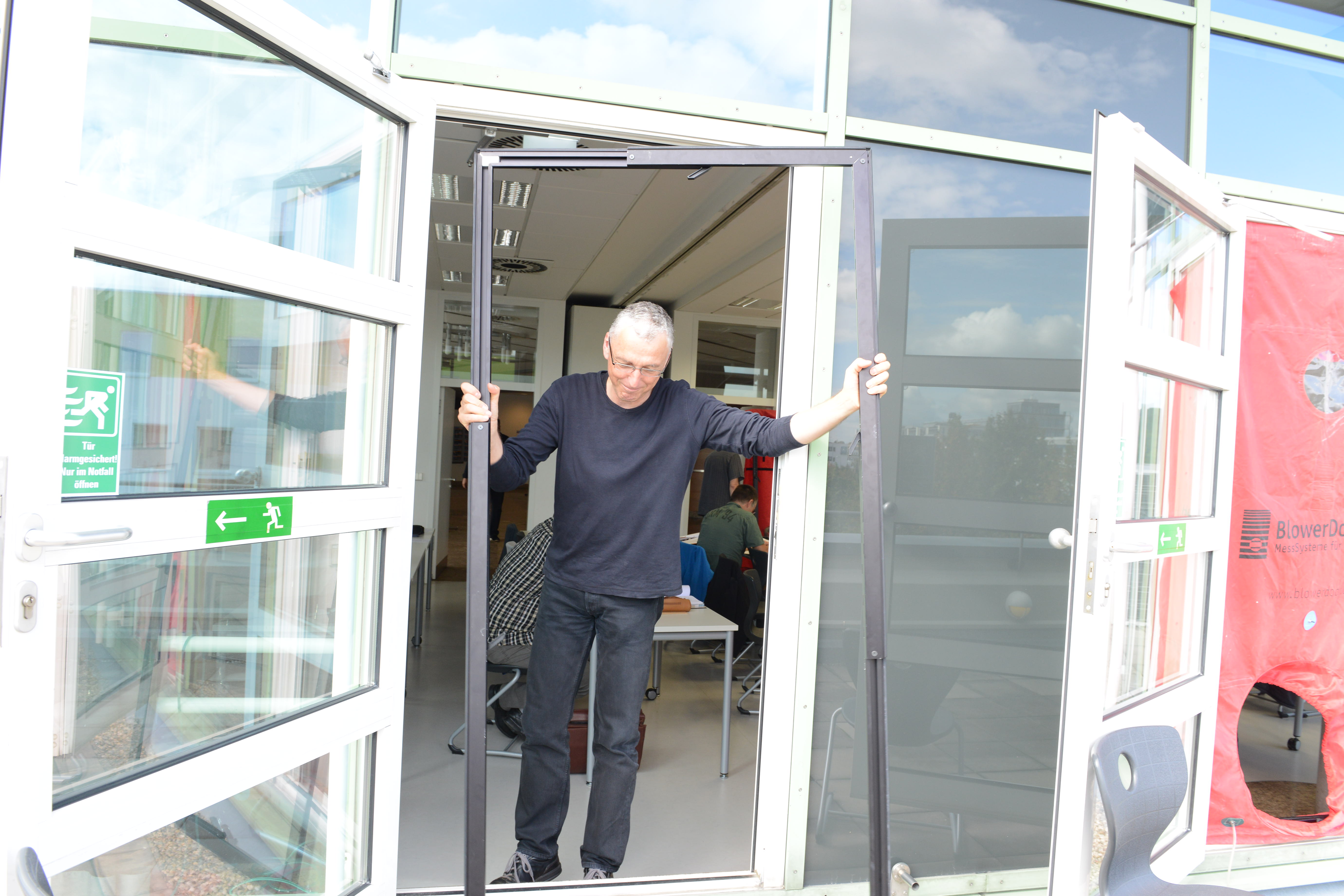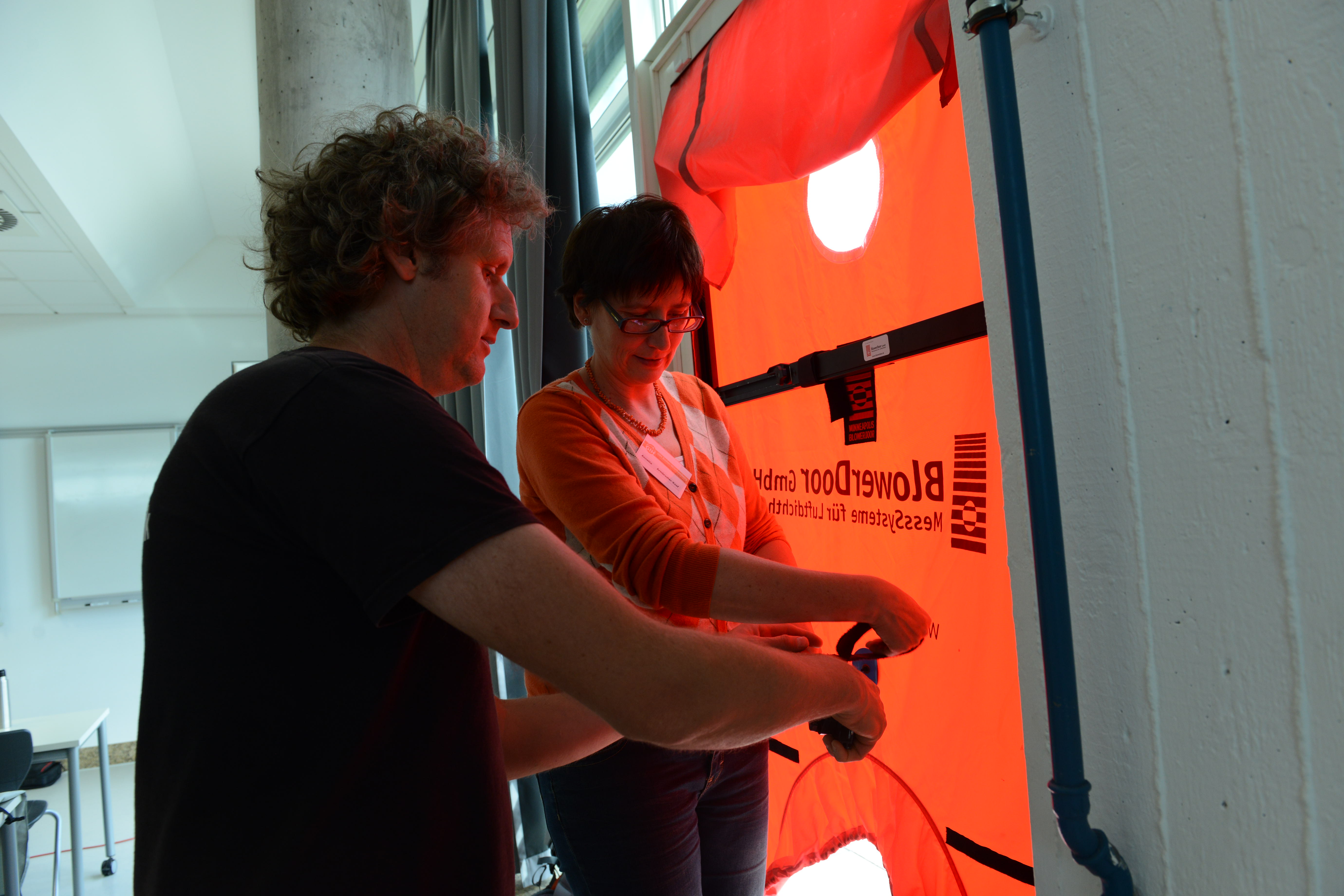Ein Schwerpunkt des Schulungstags am Samstag war der praktische Aufbau der BlowerDoor-Ausrüstung und der Ablauf einer Messung. „Theoretisch ist der Einbau eines Blowerdoorgebläses leicht: Rahmen einbinden, roter Mantel drüber, und Gebläse rein. Aber die meisten Baustellen bieten keine Laborbedingungen: es ist häufig feucht, schmutzig und keine gerade Fläche. Dazu kommt, dass die Platzverhältnisse sehr beengt sind,“, so Holger Merkel „,daher lernen die Teilnehmer hier zum einen die Messausrüstung auch bei engem Raum aufzubauen: also stehend. Zudem zeigen Thomas und ich, welche Türen ungünstige Bedingungen für den Einbau bieten und wie man sich trotzdem behelfen kann.“