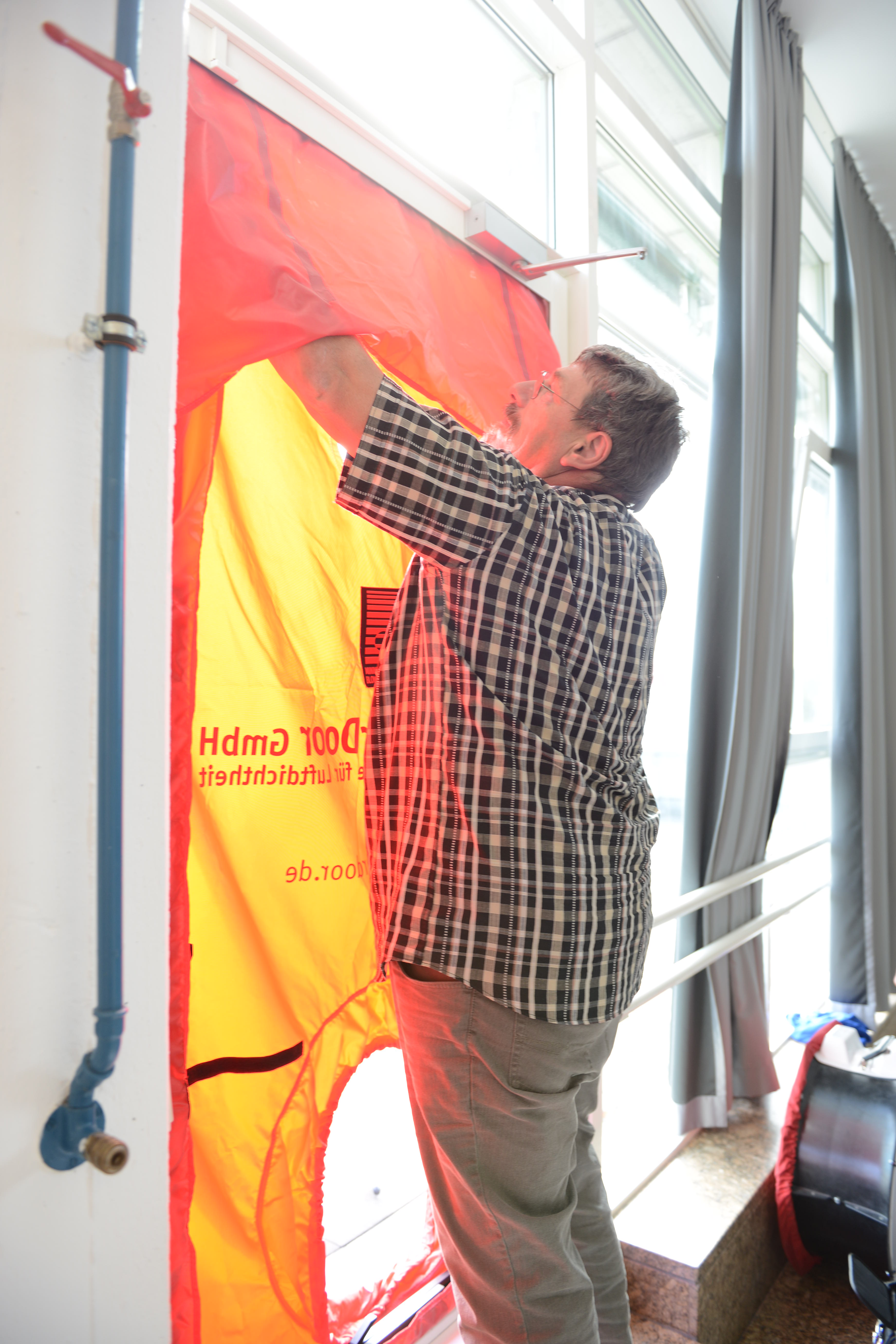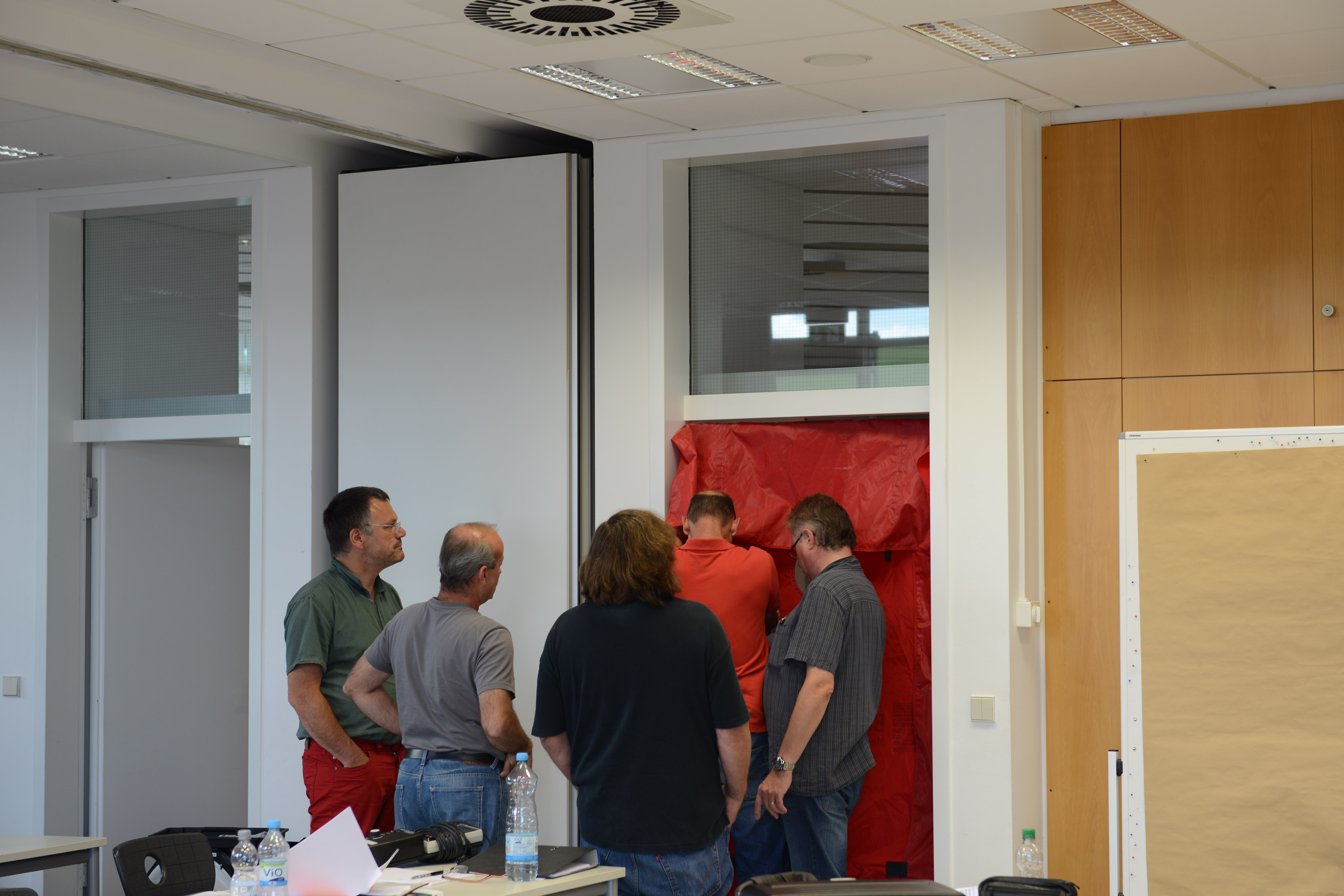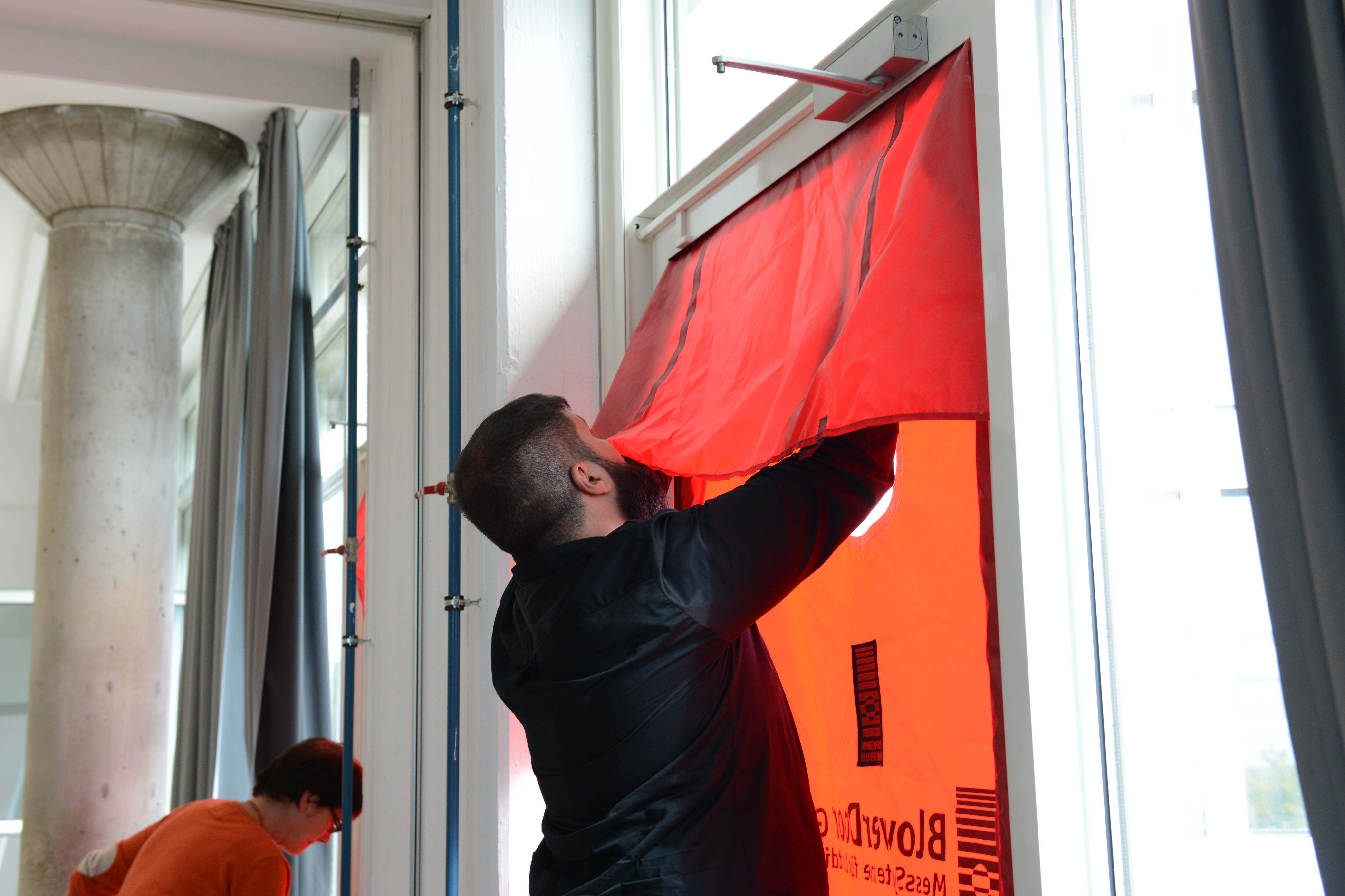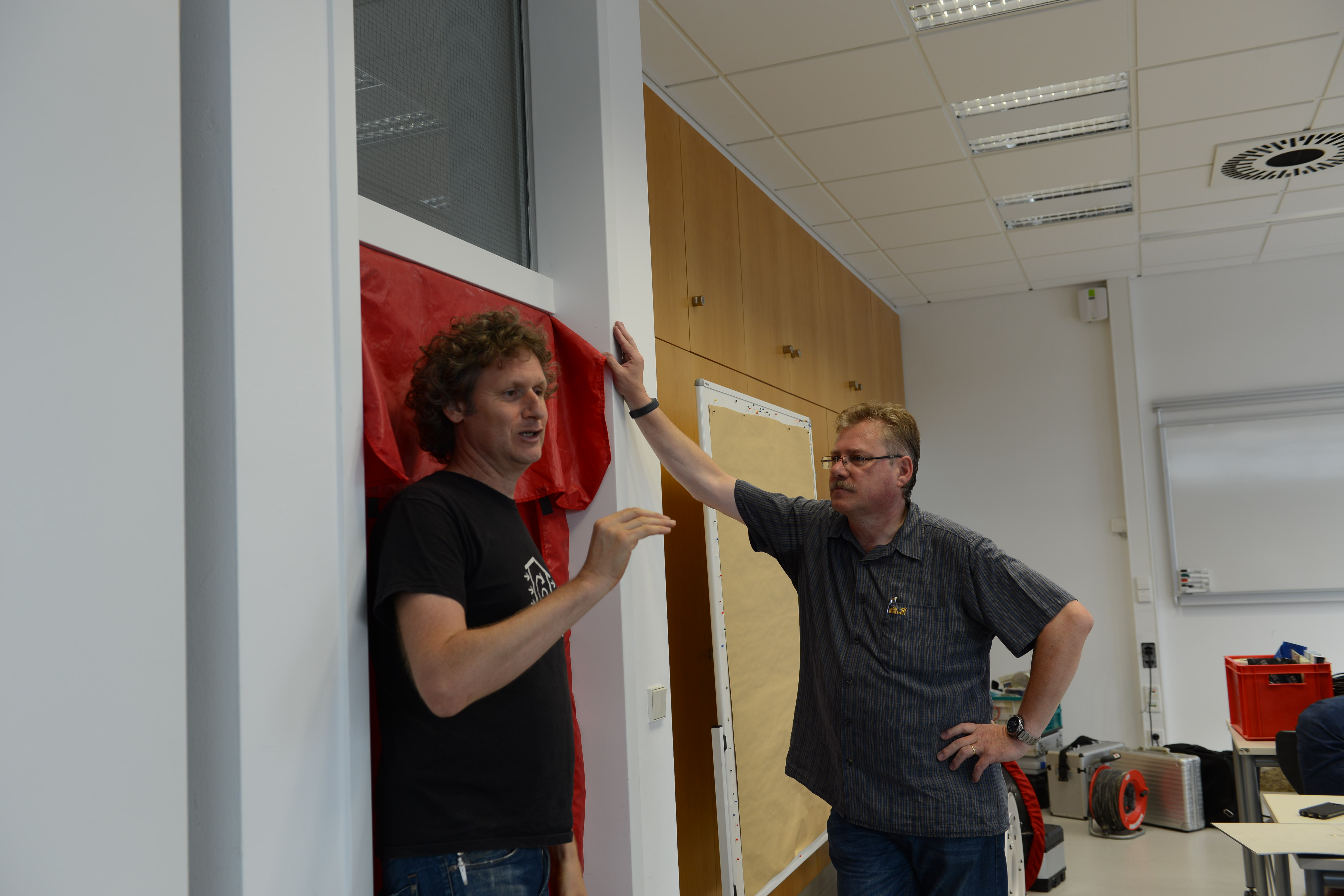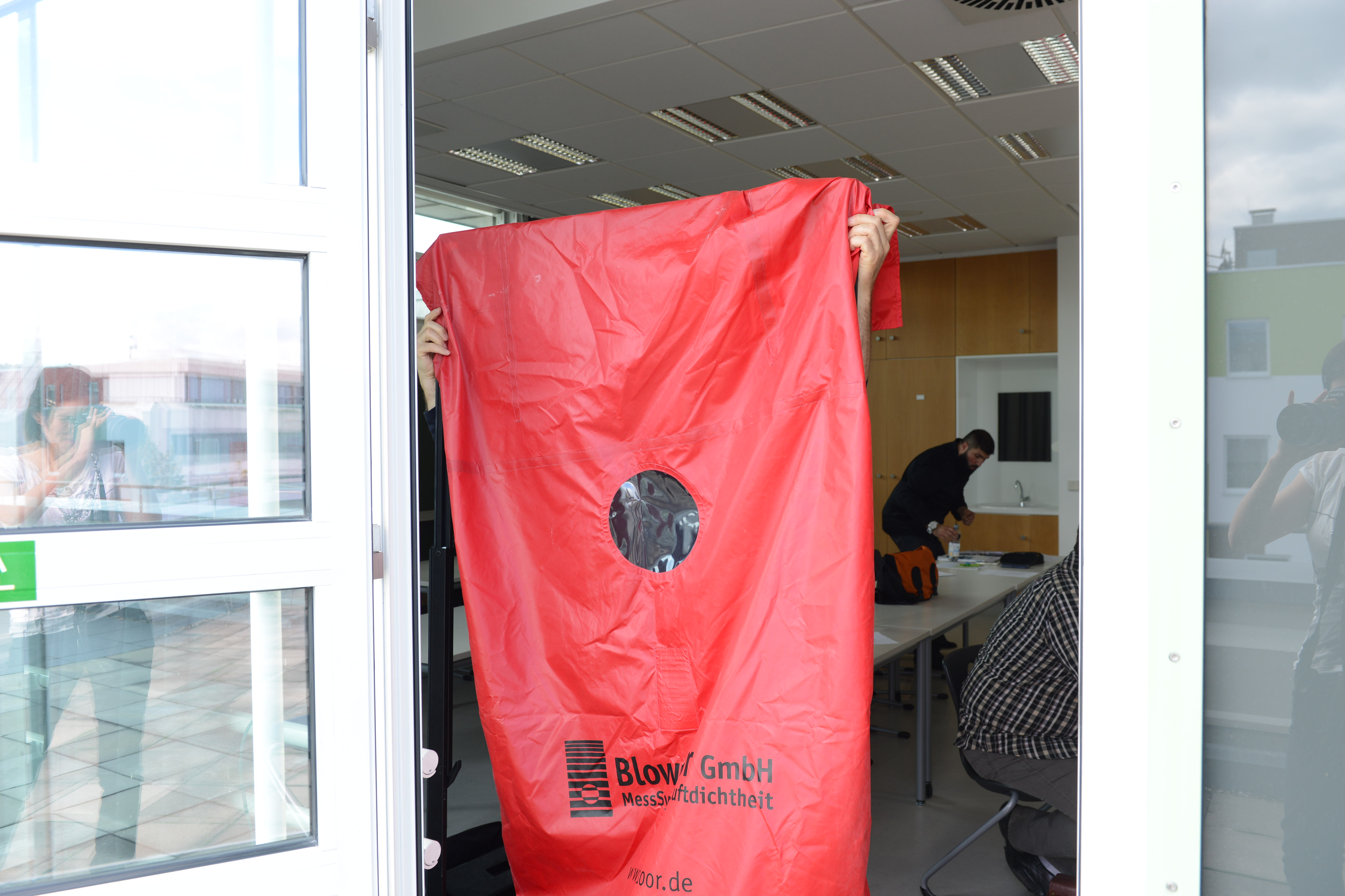 Ein Schwerpunkt des Schulungstags am Samstag war der praktische Aufbau der BlowerDoor-Ausrüstung und der Ablauf einer Messung. „Theoretisch ist der Einbau eines Blowerdoorgebläses leicht: Rahmen einbinden, roter Mantel drüber, und Gebläse rein. Aber die meisten Baustellen bieten keine Laborbedingungen: es ist häufig feucht, schmutzig und keine gerade Fläche. Dazu kommt, dass die Platzverhältnisse sehr beengt sind,“, so Holger Merkel „,daher lernen die Teilnehmer hier zum einen die Messausrüstung auch bei engem Raum aufzubauen: also stehend. Zudem zeigen Thomas und ich, welche Türen ungünstige Bedingungen für den Einbau bieten und wie man sich trotzdem behelfen kann.“