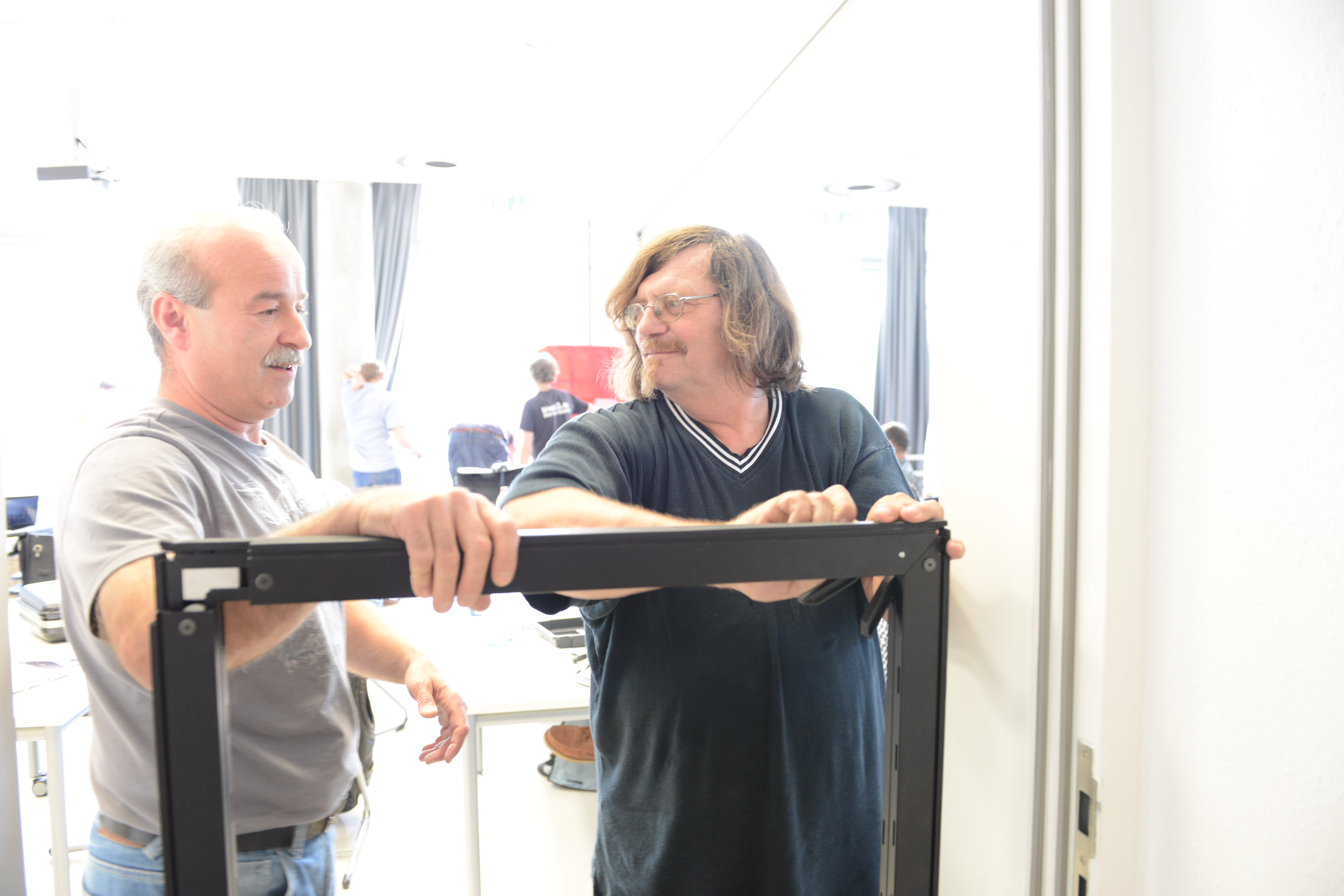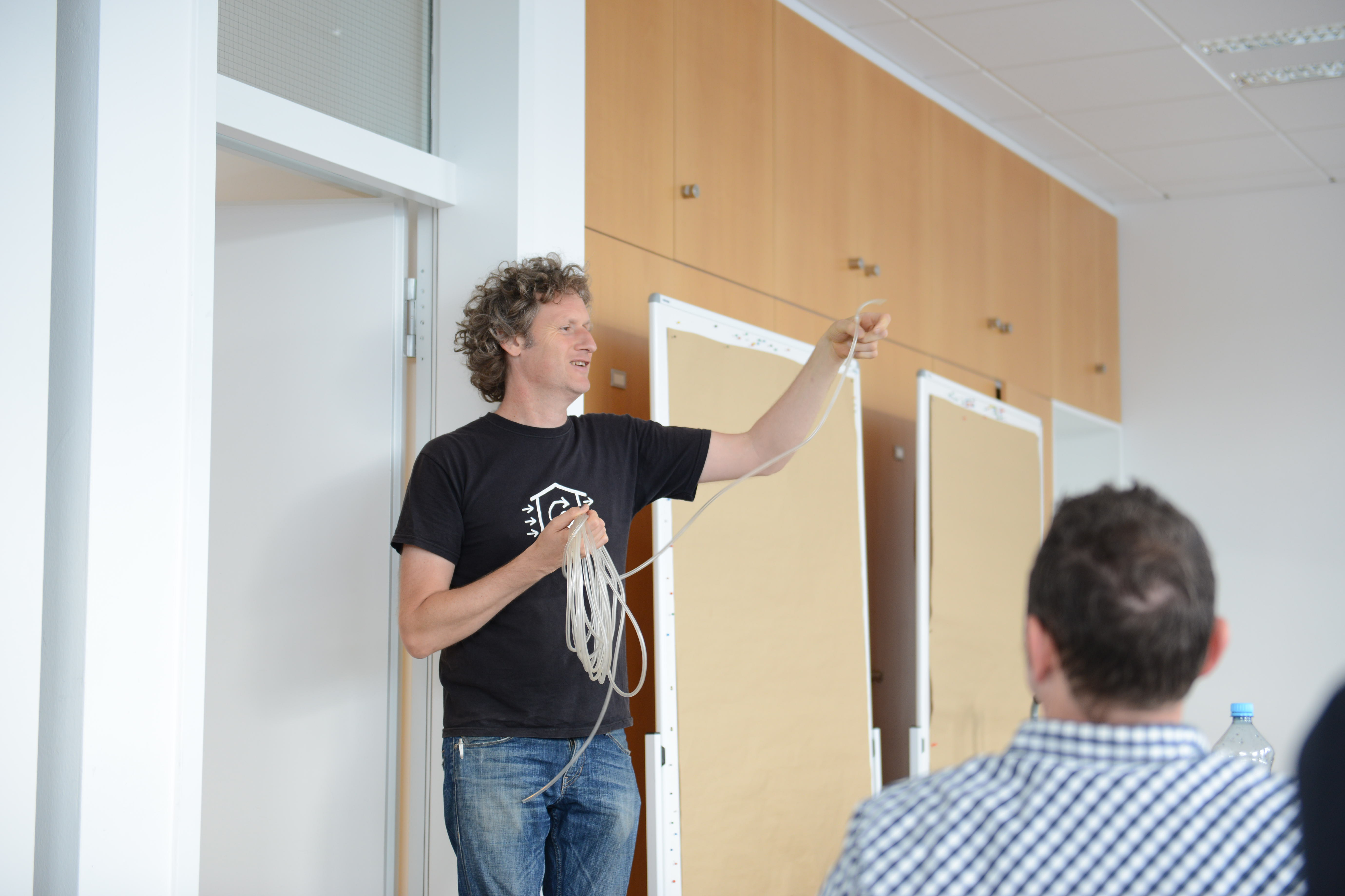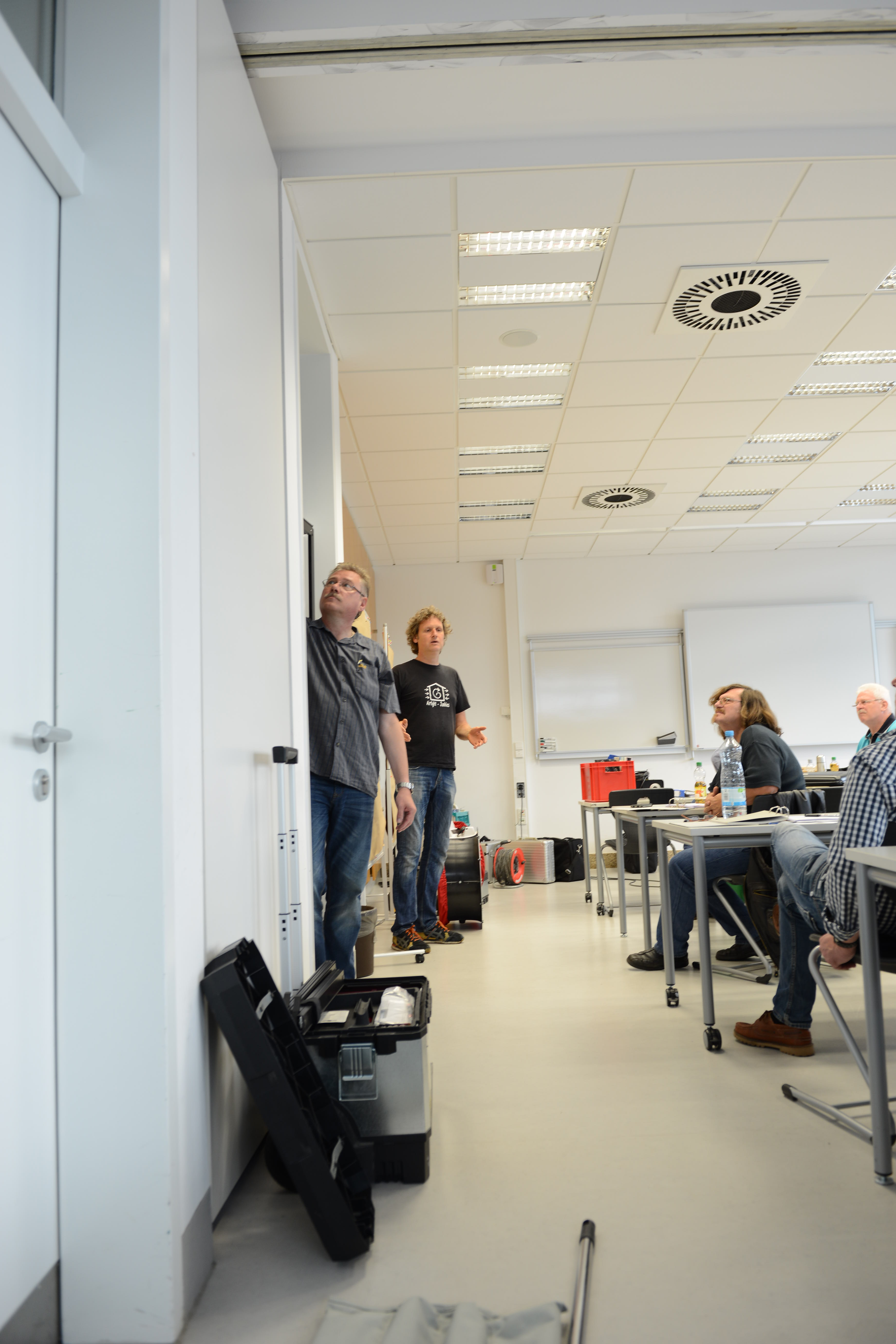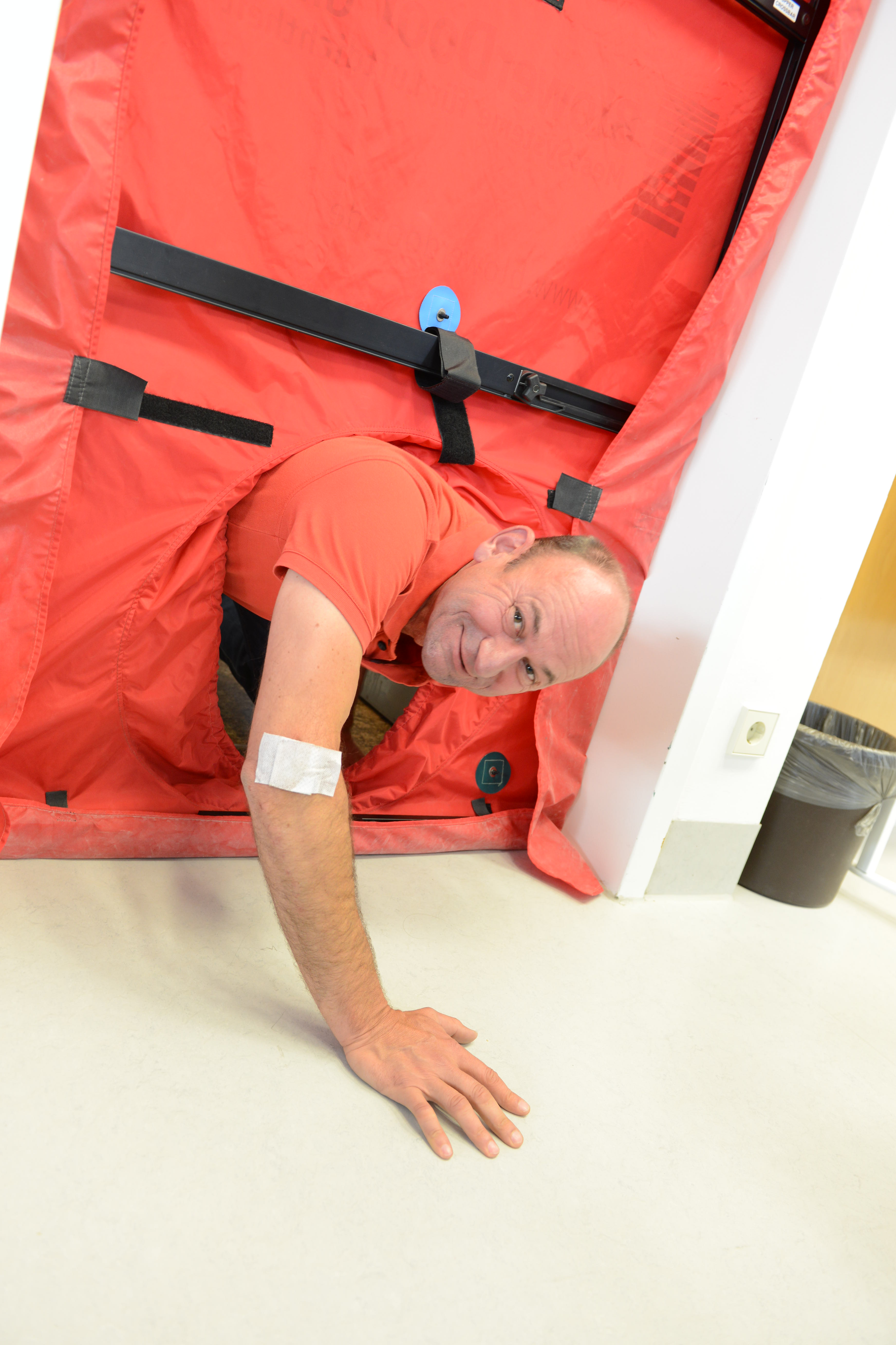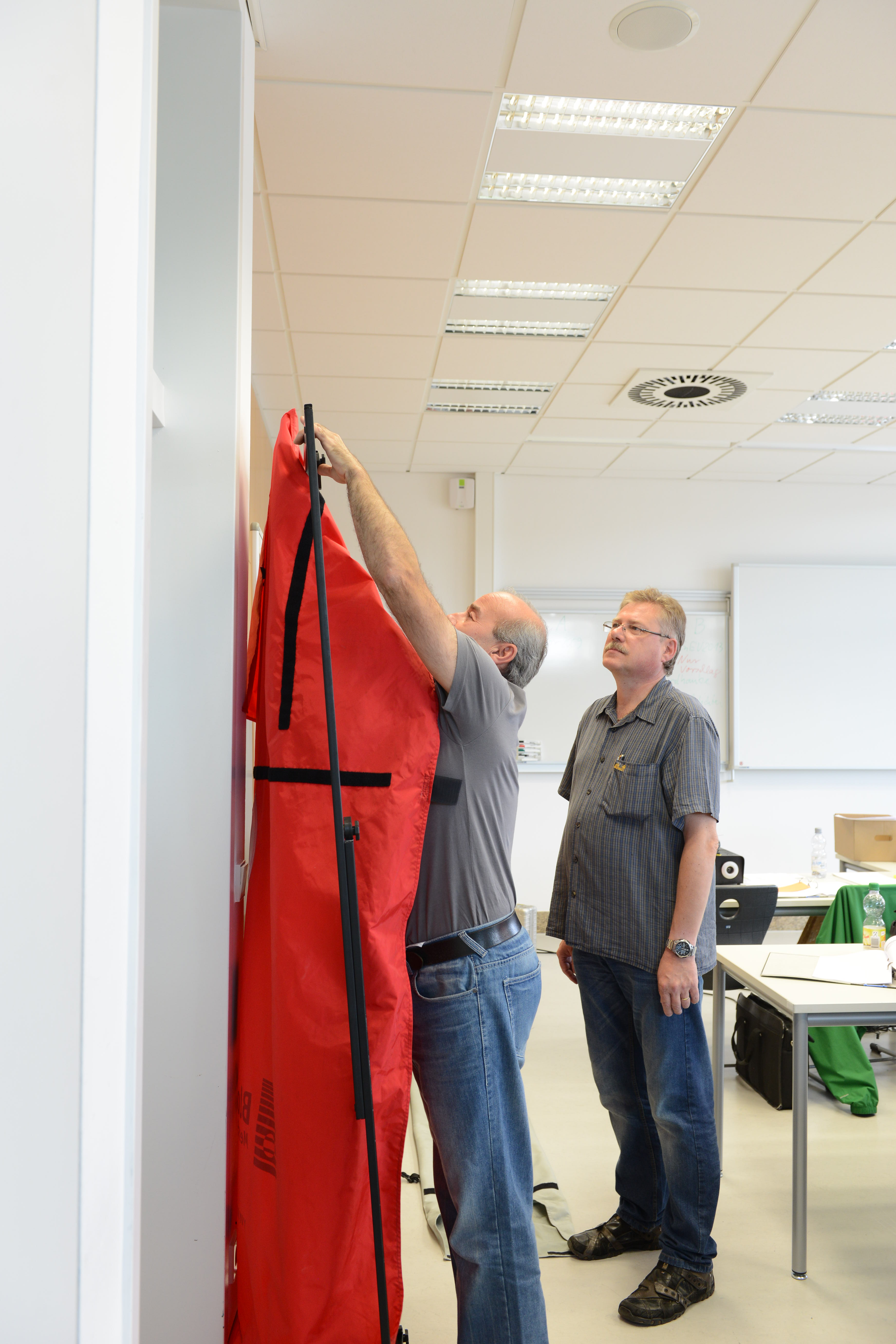 Ein Schwerpunkt des Schulungstags am Samstag war der praktische Aufbau der BlowerDoor-Ausrüstung und der Ablauf einer Messung. „Theoretisch ist der Einbau eines Blowerdoorgebläses leicht: Rahmen einbinden, roter Mantel drüber, und Gebläse rein. Aber die meisten Baustellen bieten keine Laborbedingungen: es ist häufig feucht, schmutzig und keine gerade Fläche. Dazu kommt, dass die Platzverhältnisse sehr beengt sind,“, so Holger Merkel „,daher lernen die Teilnehmer hier zum einen die Messausrüstung auch bei engem Raum aufzubauen: also stehend. Zudem zeigen Thomas und ich, welche Türen ungünstige Bedingungen für den Einbau bieten und wie man sich trotzdem behelfen kann.“